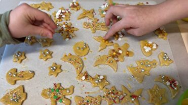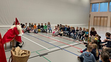 Die Klasse 3b war bei der Kindergartengruppe C. Dort haben wir mit unserem Götti-/ Gotti-Kind Mailänderli gebacken. Diese konnten wir auch verzieren. Das war richtig cool. Zusammen haben wir die Liede...