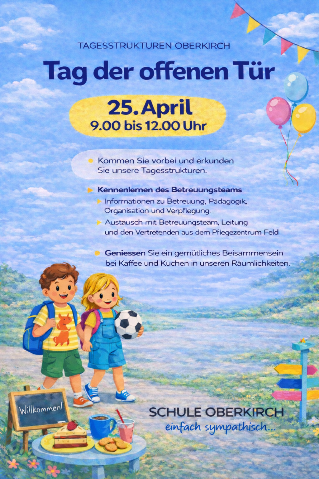 Um sich frühzeitig einen ersten Eindruck von der Tagesstruktur zu machen, laden wir Sie zum Tag der offenen Tür am Samstag, 25. April 2026 von 9.00 – 12.00 Uhr herzlich ein. An diesem Morgen wird auch Ramona Dembinski, die Leitung der Tagesstrukturen, vor Ort sein.