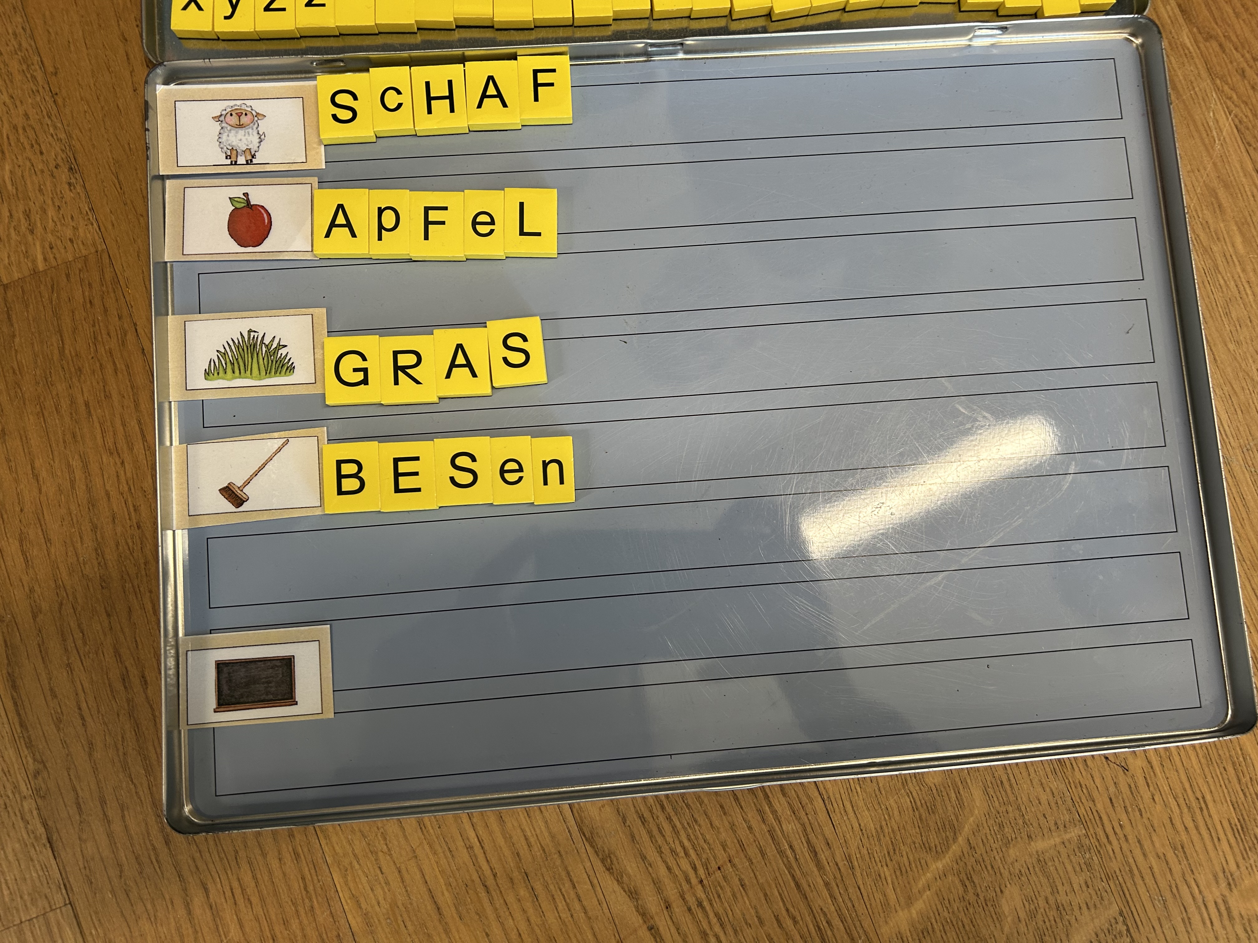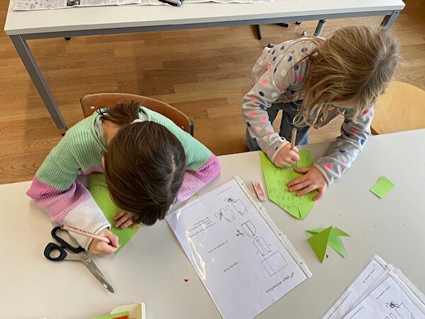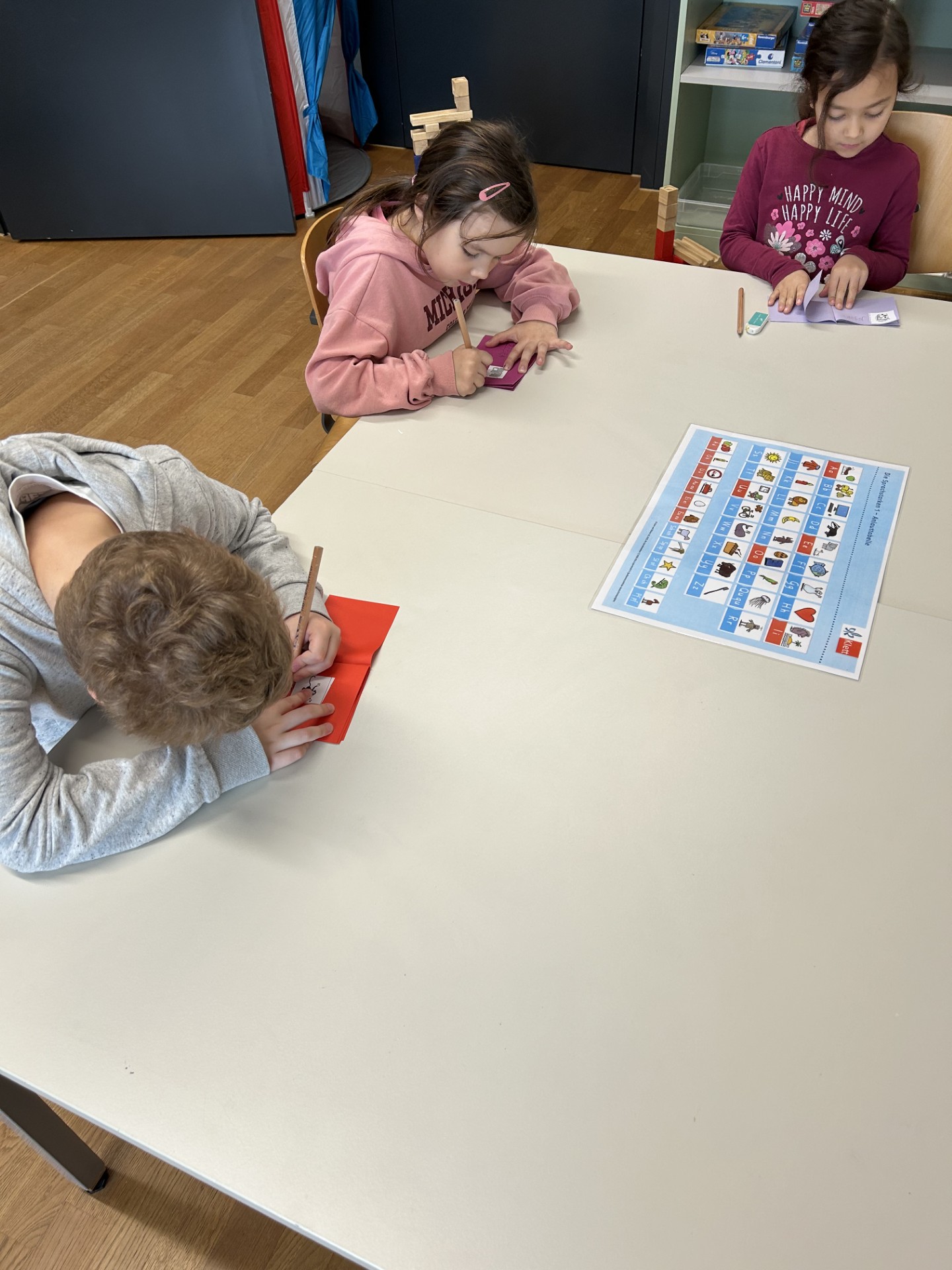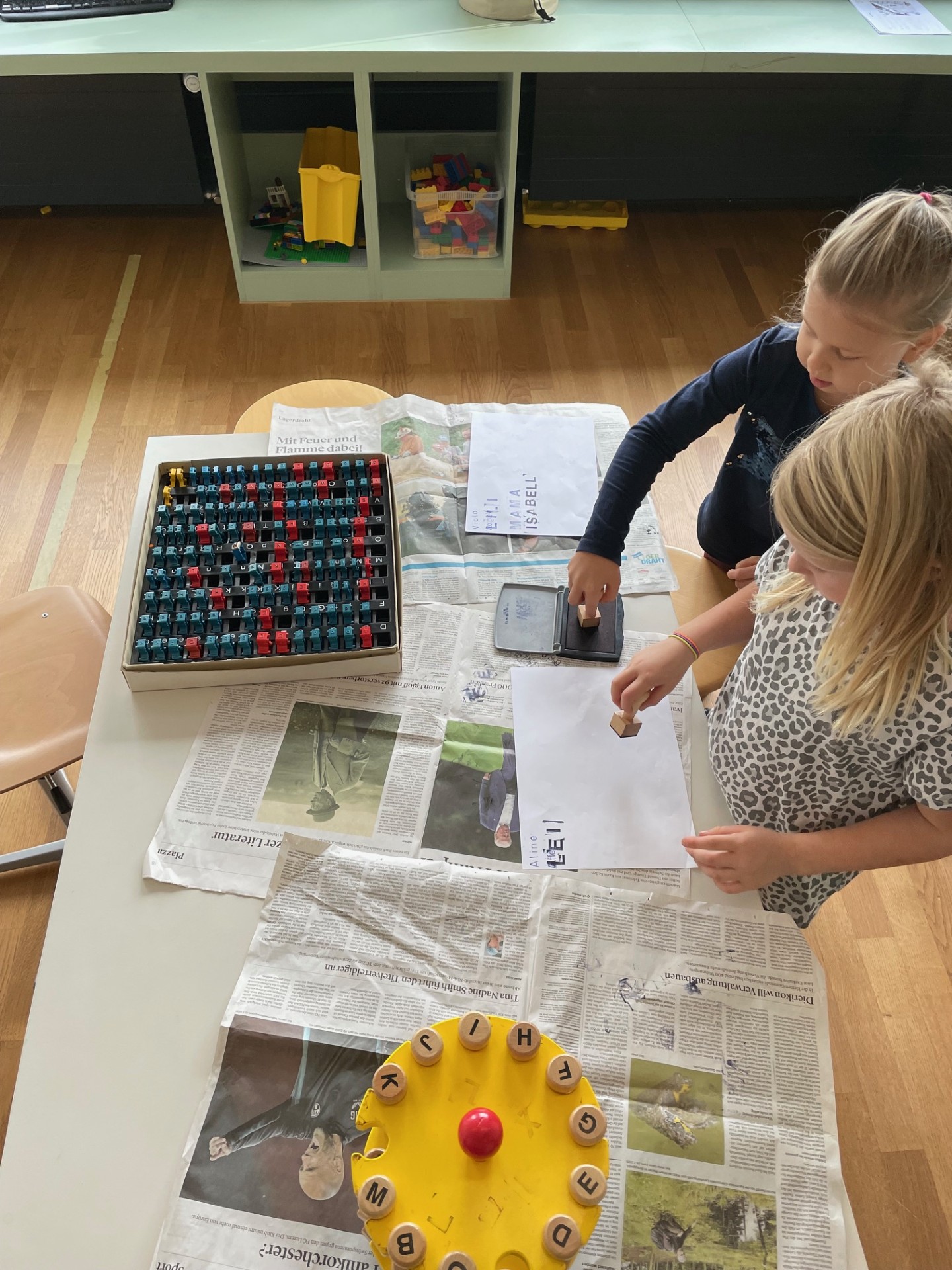 Während einigen Wochen wird in den 1. Klassen im Atelierunterricht fleissig mit Buchstaben gestempelt, gebastelt und geschrieben. Die Kinder können aus verschiedenen Angeboten auswählen und je nach Vorlieben und Können entstehen vielseitige Produkte. Sie basteln Buchstaben, stempeln Namen, stellen eigene Büchlein her oder schreiben einem Freund einen Brief. Auch ein eigenes Freudebuch kann hergestellt werden. Alle sind motiviert und fleissig. Am Ende einer Lektion zeigen sie jeweils stolz ihre Produkte und erzählen, was sie gelernt haben.